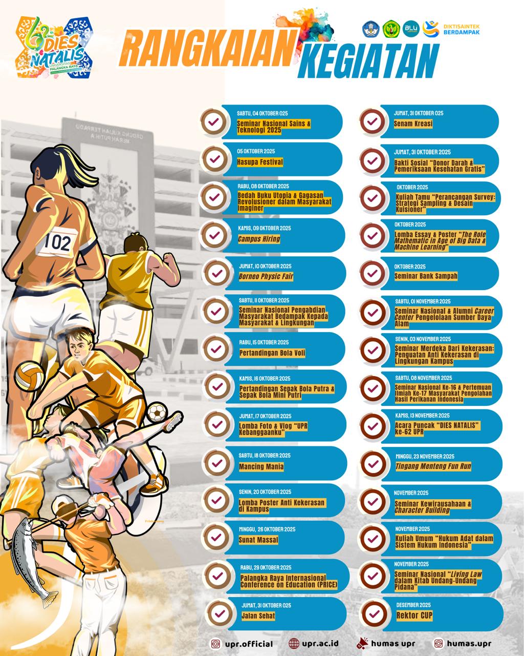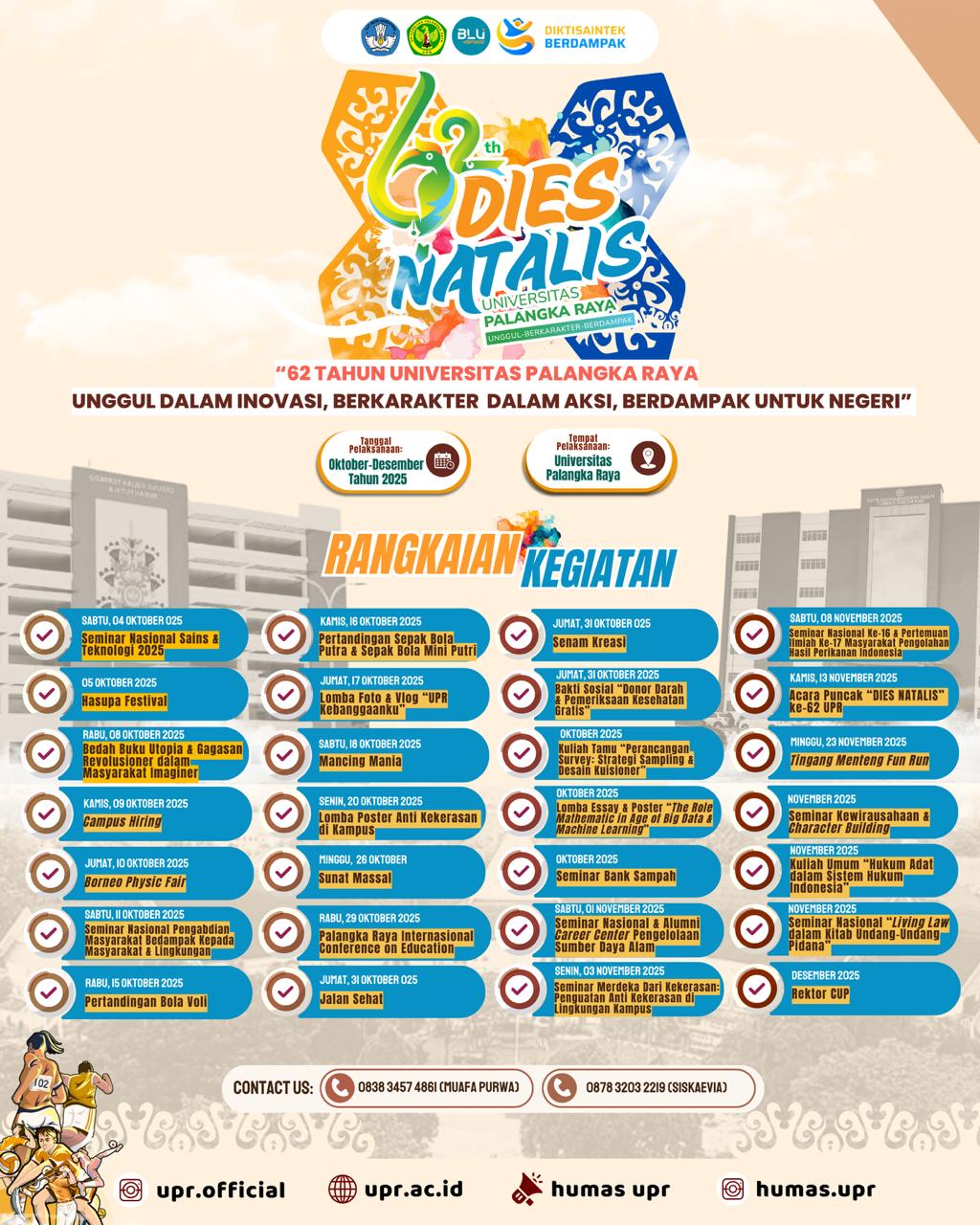 Dies Natalis ke-62 Universitas Palangka Raya (UPR) merupakan momentum penting yang menandai lebih dari enam dekade perjalanan UPR sebagai perguruan tinggi tertua dan terbesar di Kalimantan Tengah. Perayaan ini bukan hanya sekadar acara seremonial, tetapi menjadi refleksi atas perjalanan panjang universitas dalam mengembangkan pendidikan tinggi, penelitian, dan pengabdian kepada masyarakat.